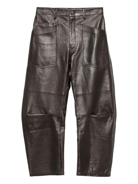 dark brown leather classic five pockets belt loops front button and zip fastening