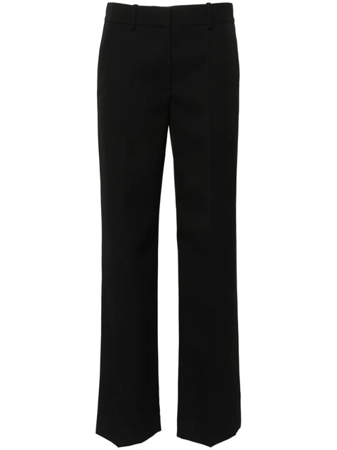 black wool twill weave belt loops two side slash pockets pressed crease full-length two rear jetted pockets straight leg concealed front button, hook and zip fastening