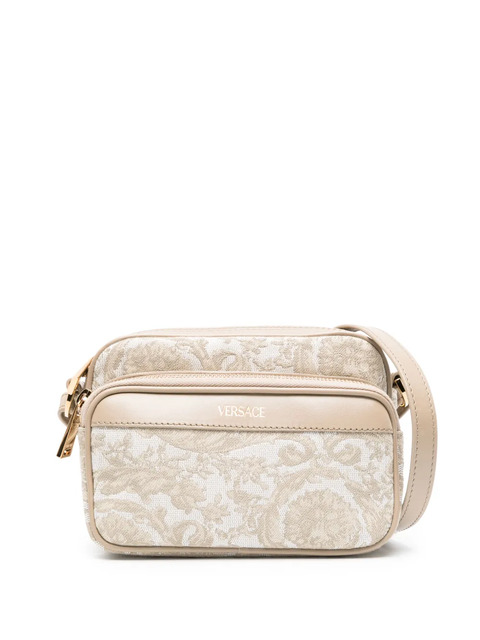 cream white/light beige canvas leather trim signature Barocco jacquard logo stamp to the front top zip fastening front zip-fastening pouch pocket adjustable detachable shoulder strap main compartment debossed internal logo internal card slots full lining gold-tone hardware This piece comes with a certificate of authenticity.