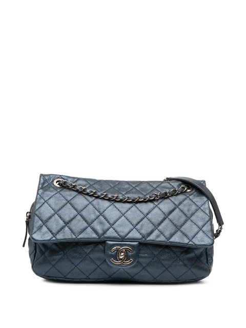 iridescent quilted caviar leather body leather woven chain strap with leather guard front flap with double Cs and twist lock closure top zip closure interior zip pocket blue Serial Number: 18247038 This item has no inclusions. Condition: GOOD. This previously owned and used item is in good condition with minimal signs of use. This may include fading of material or plating and scratches. Please refer to the photos on this product page for a detailed view of the item, including any damages declared.