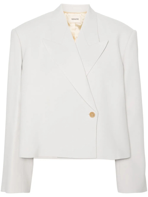 ash grey crepe texture horn-effect buttons wide peak lapels shoulder pads long sleeves buttoned cuffs cropped multiple internal slip pockets full satin lining double-breasted button fastening