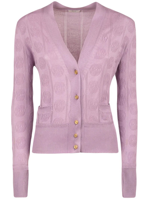 rose pink silk-cotton blend Bally Emblem motif jacquard logo motif V-neck front button fastening long sleeves straight hem ribbed trim