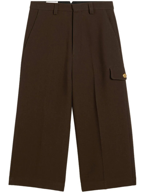 coffee brown virgin wool pressed crease belt loops slip pockets to the sides side flap pocket two rear flap pockets