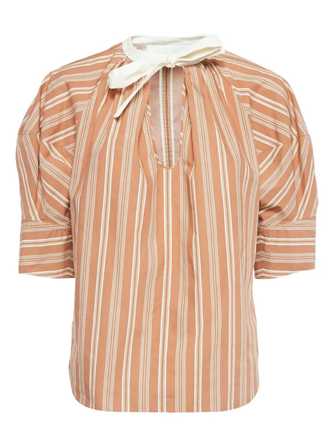 light brown cotton vertical stripe pattern silk tie-fastening neck keyhole neck short puff sleeves curved hem Condition: EXCELLENT. This previously owned item is in near-perfect condition with no signs of damage or use.