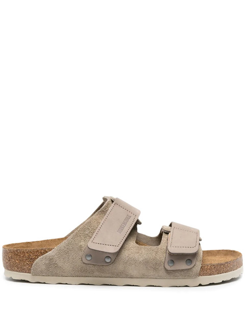 taupe grey calf leather round open toe double-strap design branded insole moulded footbed front touch-strap fastening slip-on style flat rubber sole