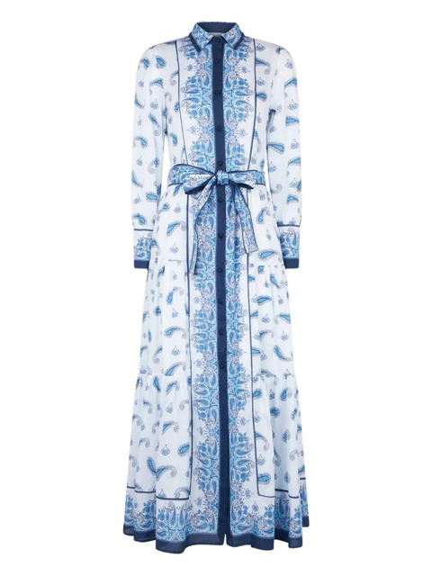 white paisley print tiered skirt button fastening belted waist long sleeves classic collar