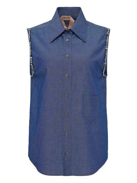 denim blue cotton sleeveless crystal embellishment button front fastening