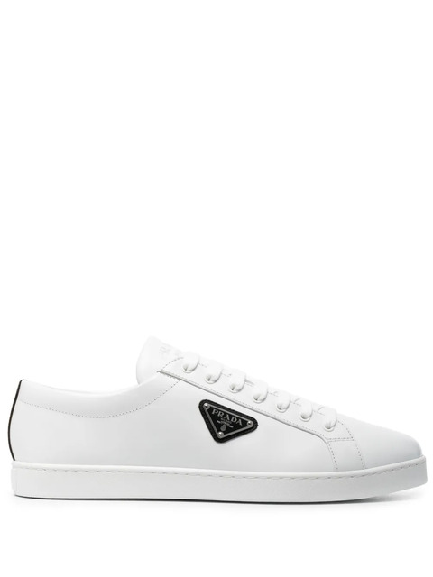 white calf leather enamel triangle logo logo-print tongue branded insole round toe front lace-up fastening flat rubber sole