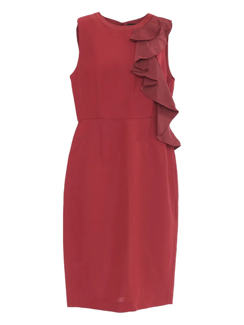 cardinal red concealed rear zip fastening round neck sleeveless ruffled trim fitted waistline rear slit mid-length Condition: GOOD. This previously owned and used item is in good condition with minimal signs of use. This may include fading of material or plating and scratches.