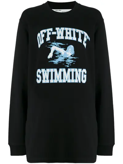 Whether you were captain of the swimming team or just revel in the occasional dip from time to time, opt for this black cotton long-length sweatshirt from Off-White printed with a swimming print to the front to wear between home and changing rooms. Featuring a crew neck, long sleeves, a graphic print, a printed logo to the front, a long length and side slits.