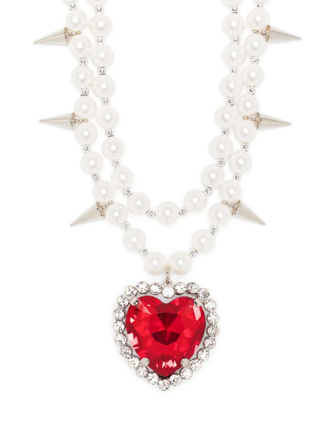 white/red glass crystal heart pendant faux-pearl chain spiked stud design silver-tone hardware lobster claw fastening adjustable-length chain