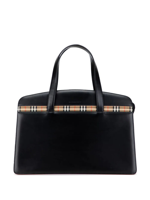 leather body with house check canvas trim flat leather handles top zip closure exterior slip pocket interior zip and slip pockets black This item has no inclusions. Condition: GOOD. This previously owned and used item is in good condition with minimal signs of use. This may include fading of material or plating and scratches. Please refer to the photos on this product page for a detailed view of the item, including any damages declared.