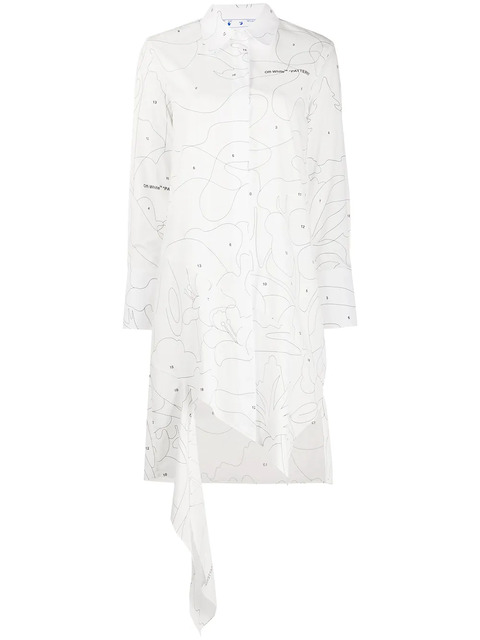 Let's get nostalgic. This white cotton Puzzle shirt dress from Off-White is decorated in a colour by numbers pattern so you can let your mind get creative. Who said shirts were boring? Featuring a classic collar, a front button fastening, long sleeves, an all-over print, an asymmetric hem and draped details.