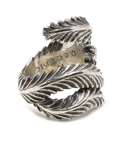 silver feather ring from YOHJI YAMAMOTO featuring silver-tone, oxidised finish, engraved detail and twist detailing.