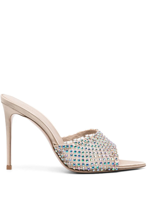 beige/gold-tone satin finish mesh design crystal embellishment pointed open toe single toe strap open back branded leather footbed 110mm high stiletto heel leather sole slip-on style