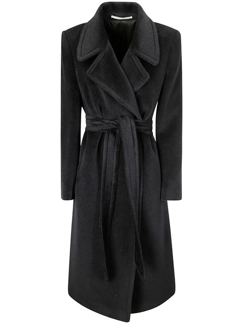 black alpaca wool-blend detachable adjustable waist strap peak lapels long sleeves internal logo patch