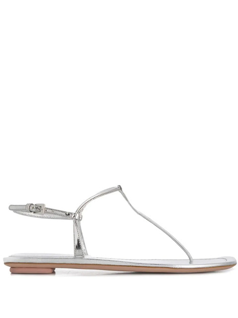 Prada brings opulence to an otherwise restrained sandal silhouette, rendering the shoe in metallic silver-tone leather. Crafted in Italy, the design features a thin thong strap and an ankle strap with a side buckle fastening, set upon a flat leather sole.
