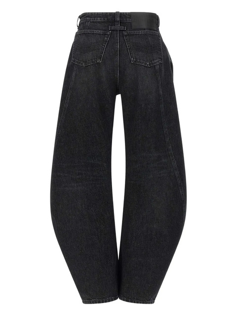 Cotton denim jeans with low waist, wide leg with side twisted stitching, front button closure, front denim band detail, leather back logo tag, pockets.100% cotton