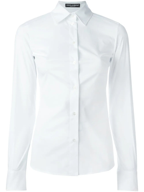 White stretch cotton classic shirt from Dolce & Gabbana featuring a classic collar, long sleeves, button cuffs, a front button fastening and a curved hem.