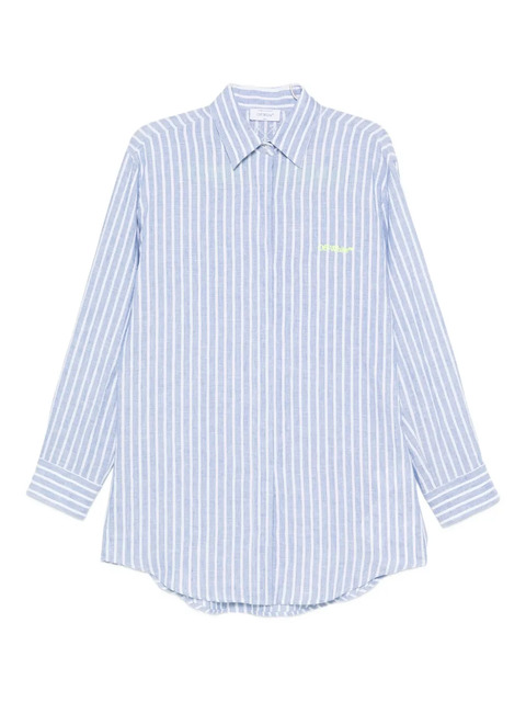blue/white linen/flax stripe detailing front button fastening long sleeves buttoned cuffs curved hem