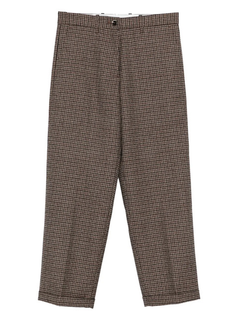 brown check pattern front button fastening belt loops rear flap pockets cuffed hem