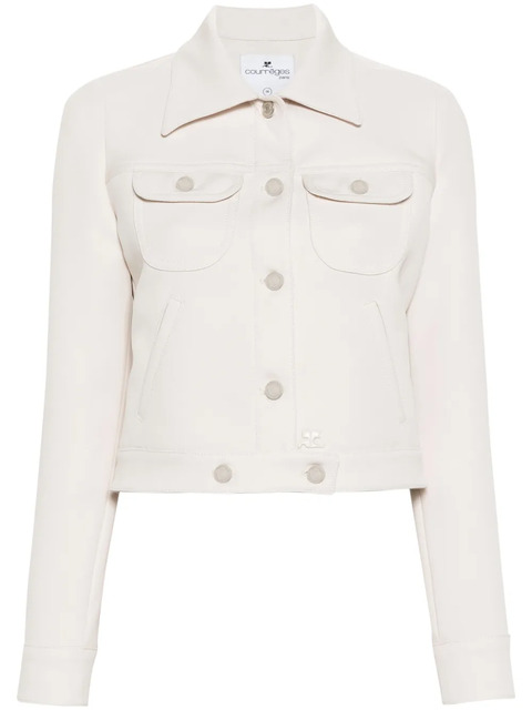 oatmeal beige classic collar long sleeves front button fastening embossed silver-tone buttons two chest flap pockets buttoned cuffs two side slit pockets logo pull-tab cropped straight hem