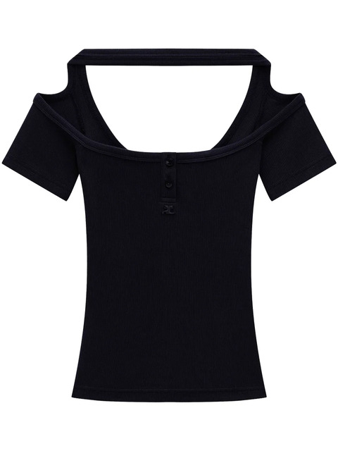 black stretch-cotton fine ribbed decorative button detailing off-shoulder short sleeves straight hem