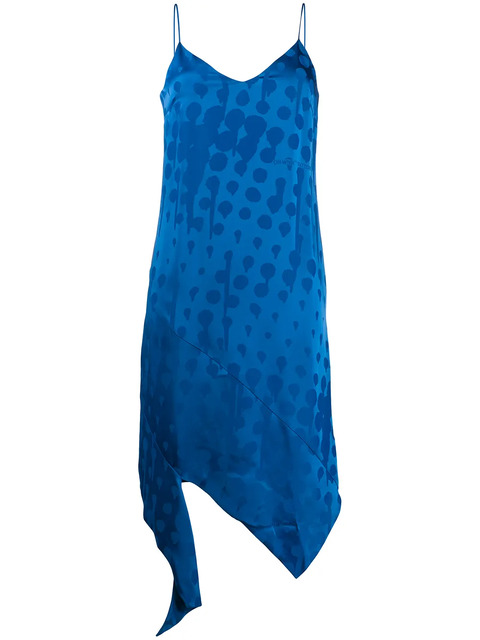 There's nothing easier than a slip dress for instant elegance. Slip on this cobalt blue jacquard-woven slip dress from Off-White to add pizzazz to your looks, whether you're going to the office or for evening drinks. Versatility is key. Featuring a sleeveless design, spaghetti straps, a v-neck, a rear zip fastening, a jacquard effect, an asymmetric hem and draped details.