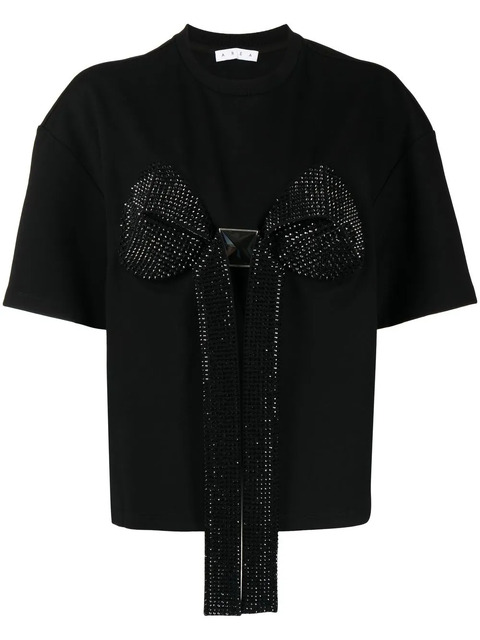 black stretch-jersey bow detailing crystal embellishment crew neck short sleeves straight hem