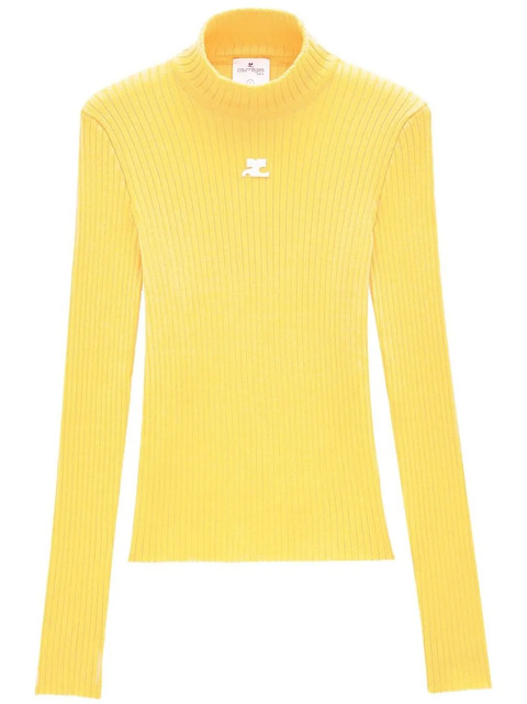 sunflower yellow cotton blend ribbed knit logo patch to the front mock neck long sleeves straight hem