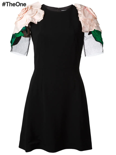 Black rose appliqué mini dress from Dolce & Gabbana featuring a round neck, a concealed rear zip fastening, a fitted waist, a flared style, a short length and sheer tulle short sleeves with oversized pink and green rose appliqués.