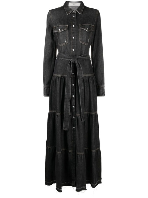 black cotton blend distressed effect classic collar front button fastening long sleeves tiered skirt two chest flap pockets long length