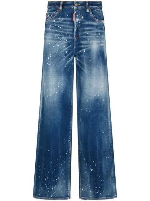 indigo blue stretch-cotton denim stonewashed whiskering effect logo tag embroidered logo to the rear paint splatter detail wide leg mid-rise belt loops front button and zip fastening classic five pockets