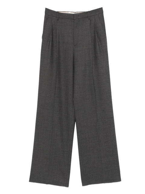grey wool blend belt loops front pleats wide leg concealed fastening