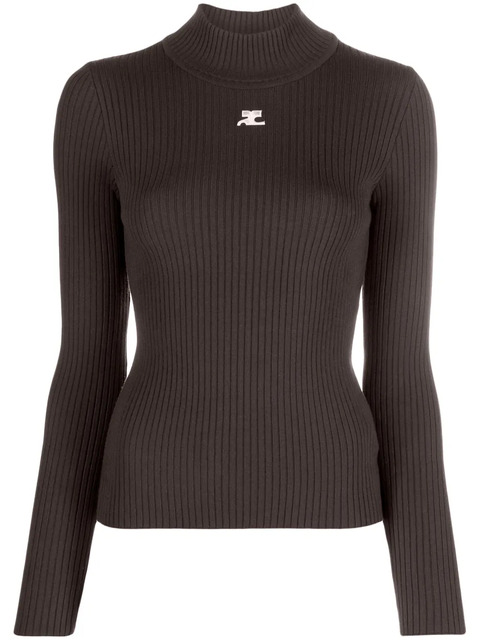 coffee brown chunky ribbed knit embroidered logo to the front high neck long sleeves finished edge
