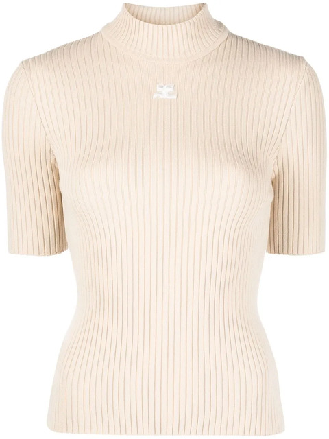 beige stretch-design knitted construction chunky ribbed knit embroidered logo to the front high neck short sleeves