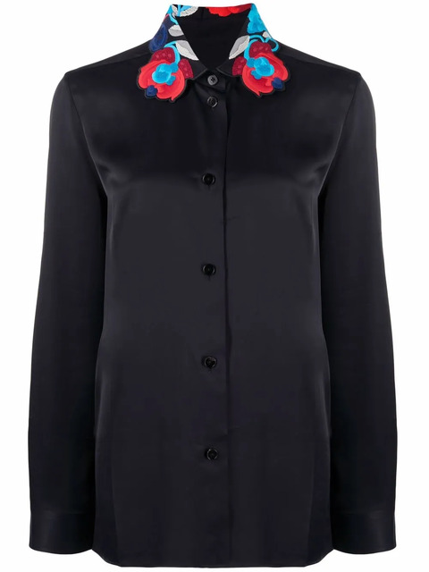dark navy blue satin finish floral-embroidered collar long sleeves buttoned cuffs front button fastening