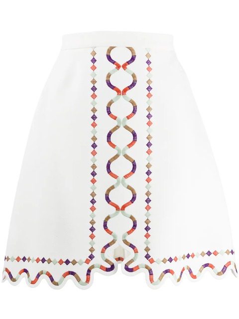 White a-line cut-out skirt from Giambattista Valli featuring a cinched waist, scallop wave hem, concealed back zip fastening and contrasting stitched motif.