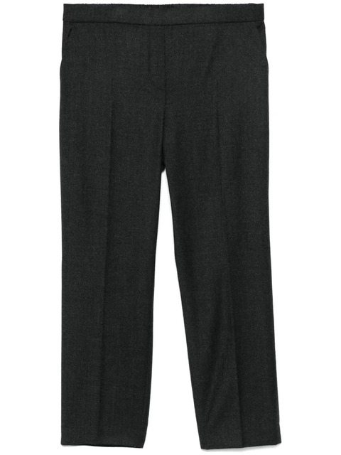 charcoal grey virgin wool flannel pull-on style two diagonal pockets to the sides rear elasticated waistband rear welt pocket tapered leg cropped leg