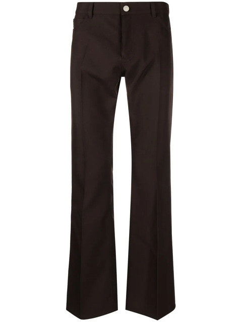 chocolate brown recycled polyester pressed crease concealed fly and button fastening belt loops two side inset pockets two rear patch pockets tailored cut