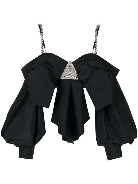 black oversize bow detail crystal embellishment adjustable shoulder straps rear zip fastening long puff sleeves cropped