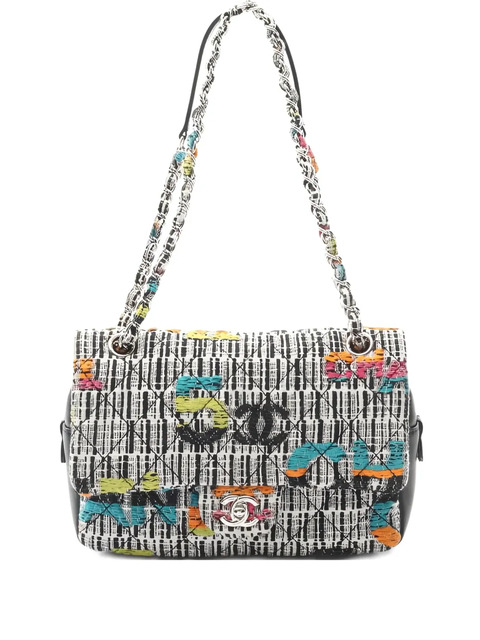 2015-2016 white/multicolour teed signature Interlocking CC logo fabric and chain shoulder strap foldover top signature Interlocking CC twist-lock fastening top zip fastening main compartment Condition: GOOD. This previously owned and used item is in good condition with minimal signs of use. This may include fading of material or plating and scratches.