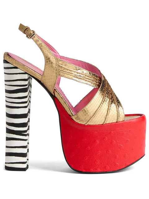 multicolour leather colour-block design zebra print metallic finish snakeskin effect open toe buckle-fastening slingback strap platform sole high block heel