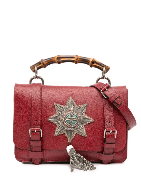 leather body bamboo top handle detachable leather shoulder strap top flap with double buckle closure interior zip and slip pockets red Serial Number: 484676 520981 Inclusions: shoulder strap. Condition: GOOD. This previously owned and used item is in good condition with minimal signs of use. This may include fading of material or plating and scratches. Declared Damages: Exterior Back Feature(s) Minor Loose Stitching. Please refer to the photos on this product page for a detailed view of the item, including any damages declared.