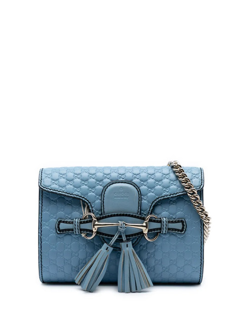 embossed leather body chain link strap with leather guard front flap with a slip through closure tassel detail interior slip pocket blue Serial Number: 449636 200047 This item has no inclusions. Condition: GOOD. This previously owned and used item is in good condition with minimal signs of use. This may include fading of material or plating and scratches. Please refer to the photos on this product page for a detailed view of the item, including any damages declared.