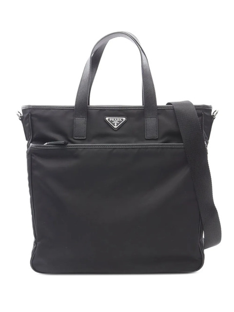 nylon body with saffiano leather trim flat leather handles detachable flat nylon strap top zip closure exterior front and back zip pocket interior zip and slip pockets black Inclusions: shoulder strap. Condition: EXCELLENT. This previously owned item is in near-perfect condition with no signs of damage or use. Due to the exclusivity of this item and its limited availability, processing and delivery might take longer than usual. Please refer to the photos on this product page for a detailed view of the item, including any damages declared.