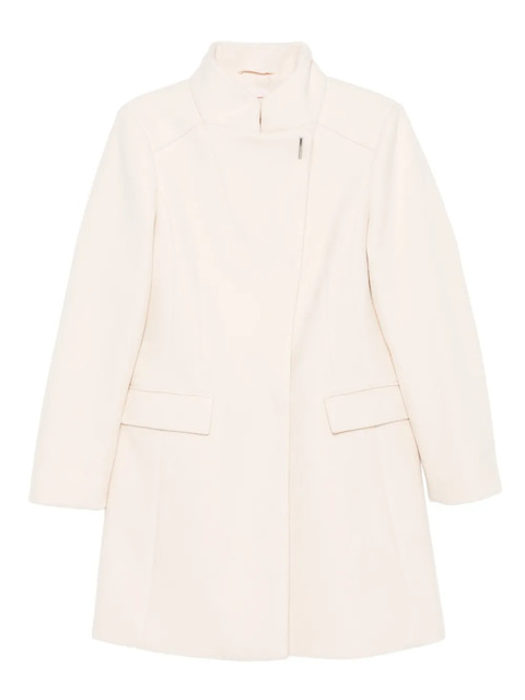 beige funnel neck concealed front fastening side flap pockets long sleeves straight hem
