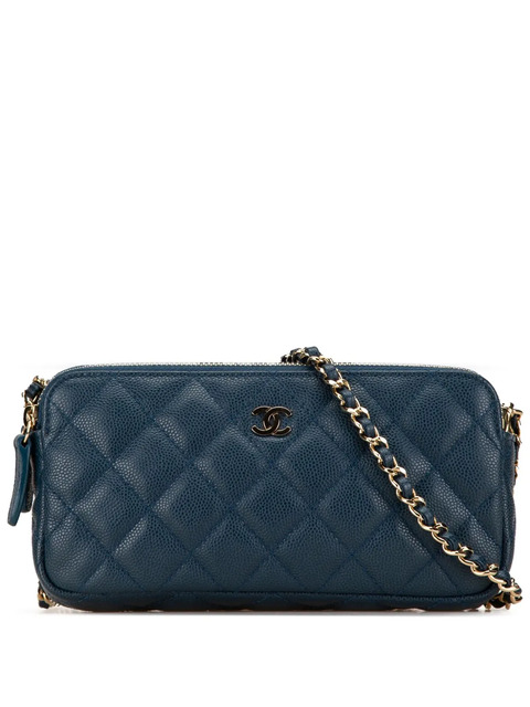 This wallet on chain features quilted caviar leather body leather woven chain strap dual top zip closures interior card slots. Blue. Serial Number: 22955534. Condition: EXCELLENT. This previously owned item is in near-perfect condition with no signs of damage or use. Due to the exclusivity of this item and its limited availability, processing and delivery might take longer than usual.