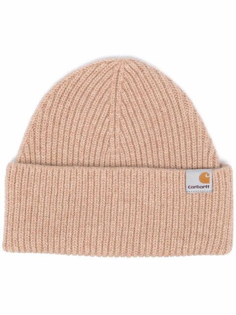 dusty brown wool-cashmere blend ribbed knit logo patch to the front turn-up brim