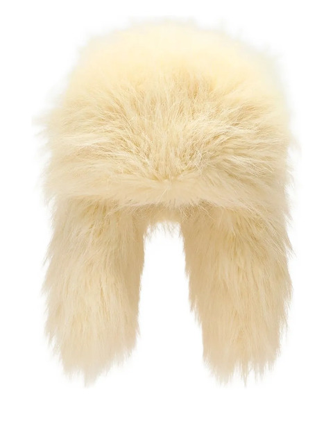 light yellow faux fur fluffy texture ear long flaps rear logo patch
